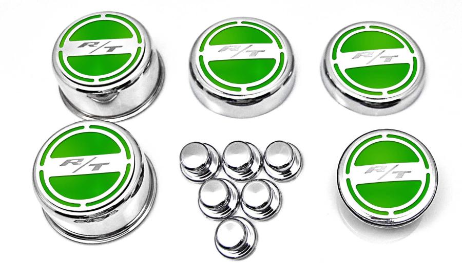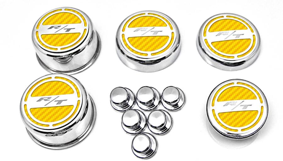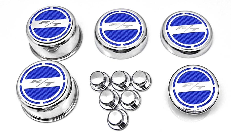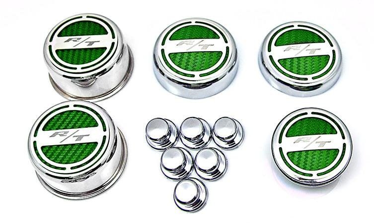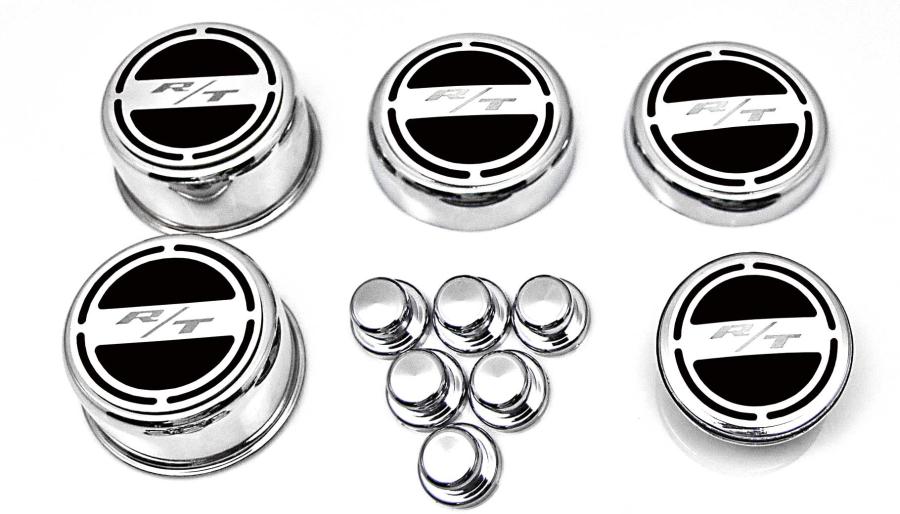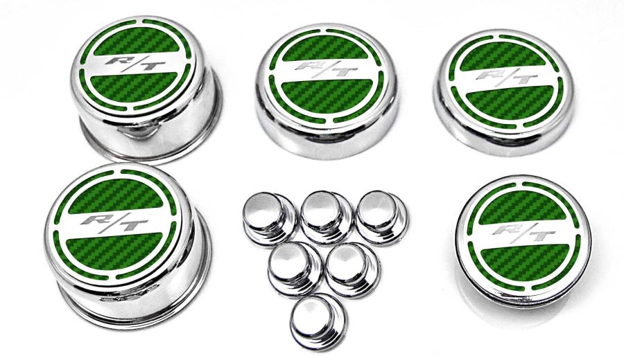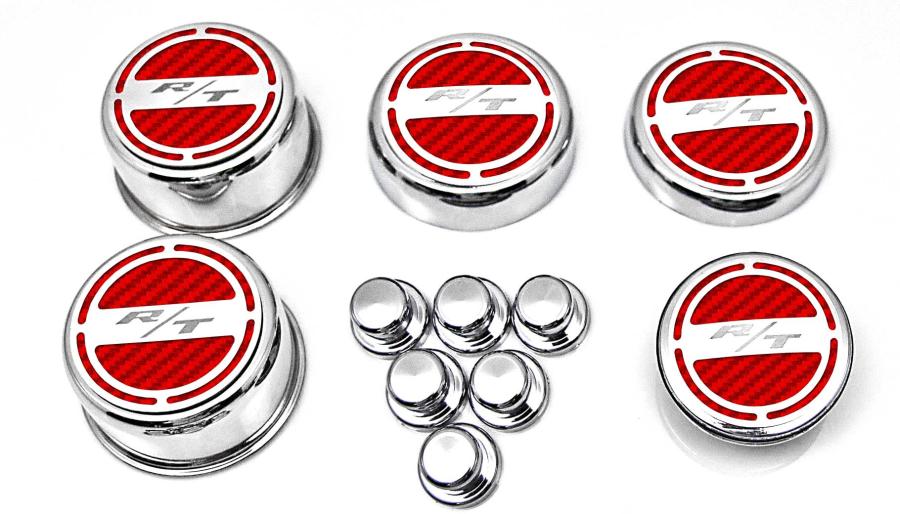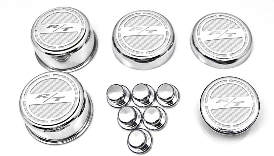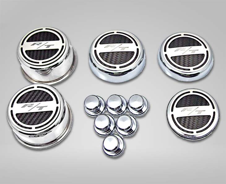 Show your engine some love when you order our Mopar Officially Licensed "RT" 11 piece Deluxe Cap Covers & Shock Tower Covers Set. Your factory shock tower domes and fluid caps will look amazing with these new covers. Our cap sets are triple chrome-plated with stainless steel caps and the faux carbon fiber vinyl patterns are available in a variety of colors. These trim pieces are designed to fit all 2008-2018 Charger / Chrysler / Dodge 5.7 Hemi Magnum V8 Engines over the stock fluid caps and shock tower domes adding a stylish look that makes everyone take notice.