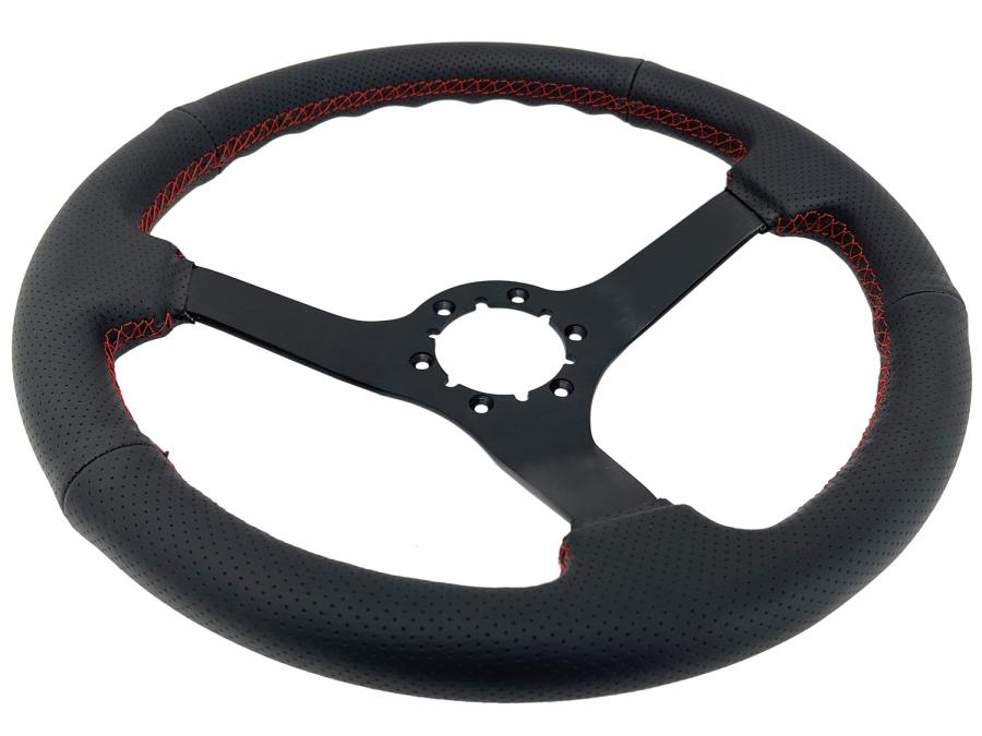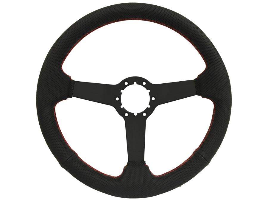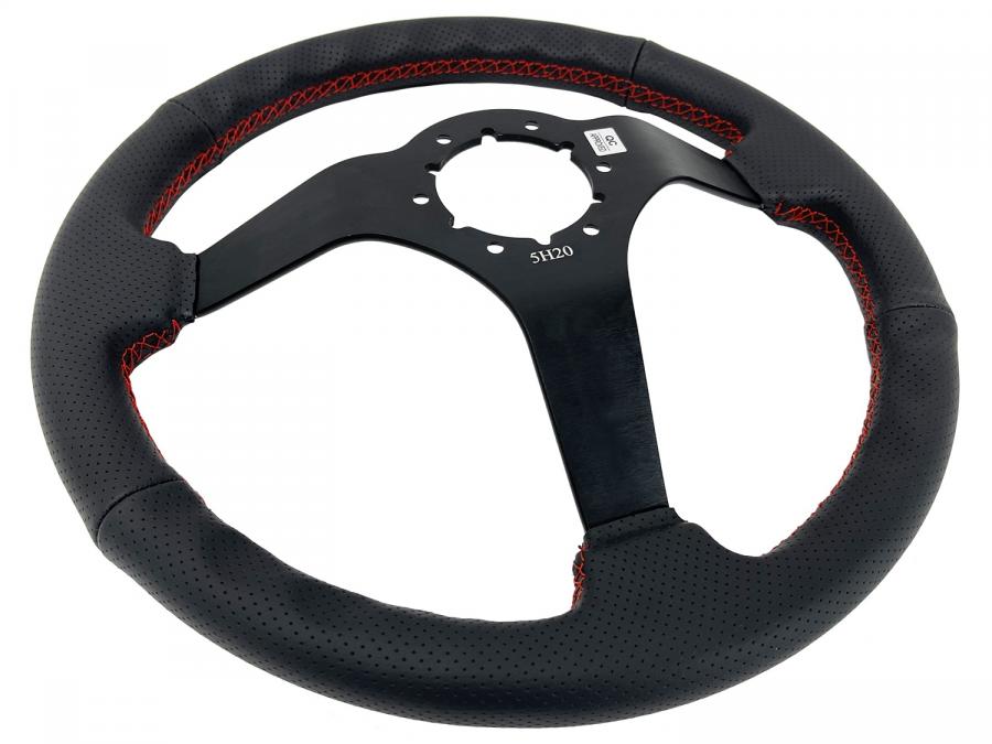 S6 Sport Leather steering wheel series come in perforated black leather grip with red stitching option with black anodized center finish and solid spoke design. They feature a 14 in. diameter with a 2.5 in. depth for turn signal clearance.