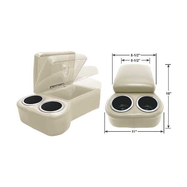 How's this for a great idea? This BC Seat Cruiser Console is specifically designed to fit on any bench seat, it features 2 king size drink holders, now with chrome edge trim, plus the hinged top opens to reveal a large storage compartment. The console top is softly padded to provide you with a comfortable armrest & a sewn-in strap is provided to secure the console to the seat. Available in a dozen beautiful colors, the entire console is upholstered in long wearing automotive grade vinyl with double stitched French seams to complement almost any interior.