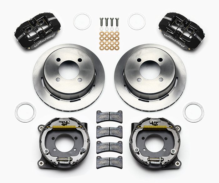 Forged Dynapro Low-Profile Pro-Series rear disc brake kits provide a complete solution for popular muscle car rear axles on applications that require a parking brake assembly and extra clearance for 14.00” to 15.00” rim applications. Forged billet Dynapro Low-Profile four-piston calipers 11.00” one-piece hat and rotor assemblies, and high friction pads provide optimized and balanced braking for all types of custom performance street/strip and show machines. The neatly hidden internal shoe system provides a clean installation with superior static holding power for parking. Optional caliper finishes and rotor designs enable the builder to personalize the style and optimize brake performance for every individual application.