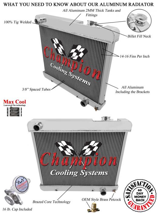Our Economy series radiators are designed for car enthusiasts looking for an affordable cooling solution for their classic car that is nearly stock condition. Though some muscle cars or modified vehicles with a higher horsepower rating may require one of Champion Cooling’s three or four row radiators, these economy series radiators are built with two-row brazed aluminum cores that are tig-welded to aluminum tanks with approximately 14-16 louvered fins per inch, a brass petcock, and all are designed with aircraft grade aluminum. The tubes are 3/4” thick with a 1 1/2” core. In most cases this all aluminum design allows for stronger wider tubes that enable a two row aluminum radiator to outperform a three row copper brass of equal dimensions, while also being more affordable and lighter weight. We recommend this series for most applications with 500 horsepower or less.