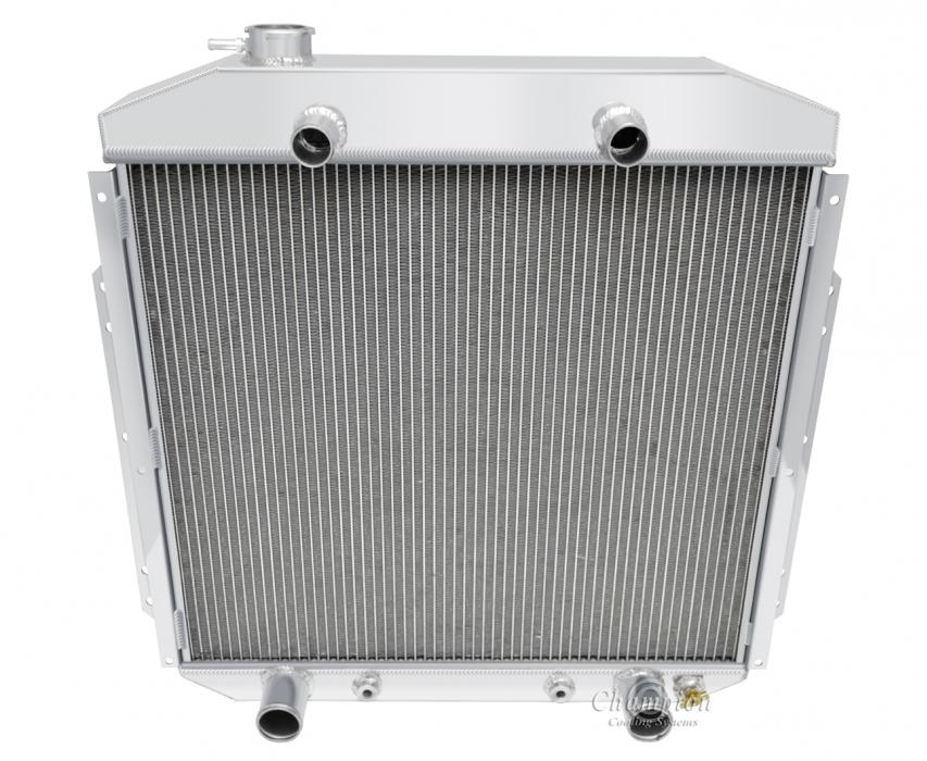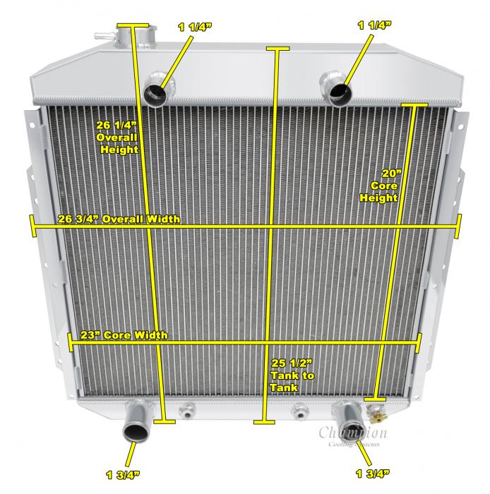 Our Economy series radiators are designed for car enthusiasts looking for an affordable cooling solution for their classic car that is nearly stock condition. Though some muscle cars or modified vehicles with a higher horsepower rating may require one of Champion Cooling’s three or four row radiators, these economy series radiators are built with two-row brazed aluminum cores that are tig-welded to aluminum tanks with approximately 14-16 louvered fins per inch, a brass petcock, and all are designed with aircraft grade aluminum. The tubes are 3/4” thick with a 1 1/2” core. In most cases this all aluminum design allows for stronger wider tubes that enable a two row aluminum radiator to outperform a three row copper brass of equal dimensions, while also being more affordable and lighter weight. We recommend this series for most applications with 500 horsepower or less.