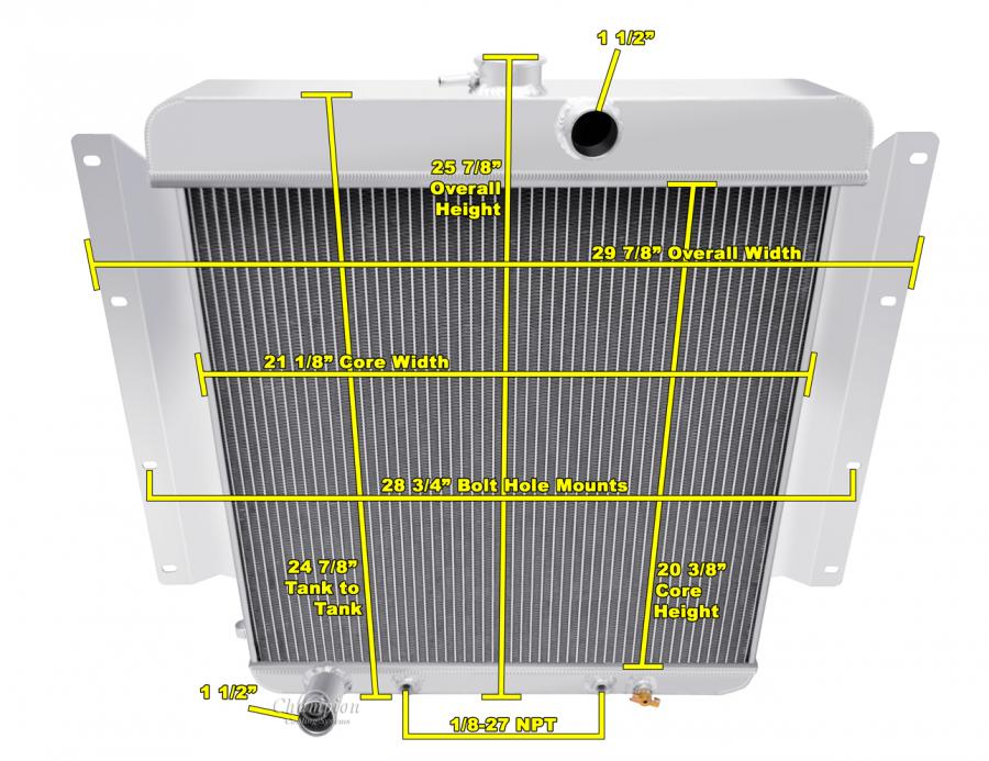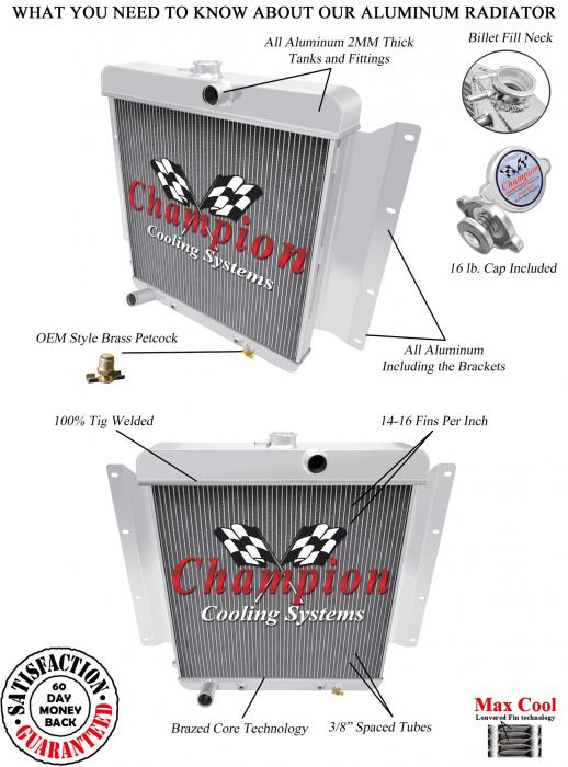 Our Economy series radiators are designed for car enthusiasts looking for an affordable cooling solution for their classic car that is nearly stock condition. Though some muscle cars or modified vehicles with a higher horsepower rating may require one of Champion Cooling’s three or four row radiators, these economy series radiators are built with two-row brazed aluminum cores that are tig-welded to aluminum tanks with approximately 14-16 louvered fins per inch, a brass petcock, and all are designed with aircraft grade aluminum. The tubes are 3/4” thick with a 1 1/2” core. In most cases this all aluminum design allows for stronger wider tubes that enable a two row aluminum radiator to outperform a three row copper brass of equal dimensions, while also being more affordable and lighter weight. We recommend this series for most applications with 500 horsepower or less.
