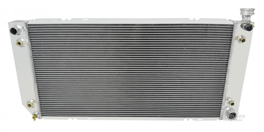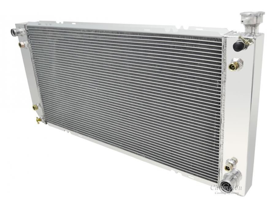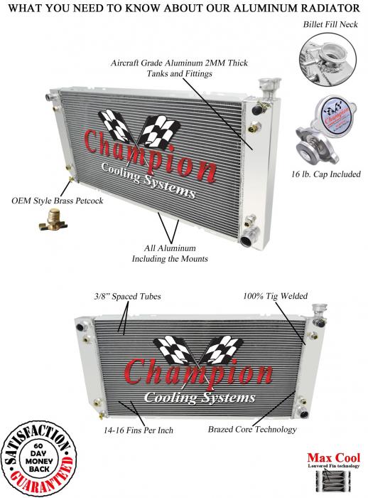 Our Champion Pro series radiators are designed to cool your high performance engine and to keep you and your car on the road. The Champion Pro series is designed using 11/16” tubes. These radiators are built with three rows of tubes, brazed aluminum cores which are tig-welded to aluminum tanks. All have approximately 14-16 louvered fins per inch, a brass petcock, and all are designed with aircraft grade aluminum. The strength of the aluminum allows for the improved design of larger tubes which allows a lightweight more affordable aluminum radiator to outperform a copper-brass radiator of similar dimensions. These radiators are typically 30-40% more efficient than their copper-brass equivalent. We would recommend one of these radiators for vehicles applications with 800 horsepower or less.