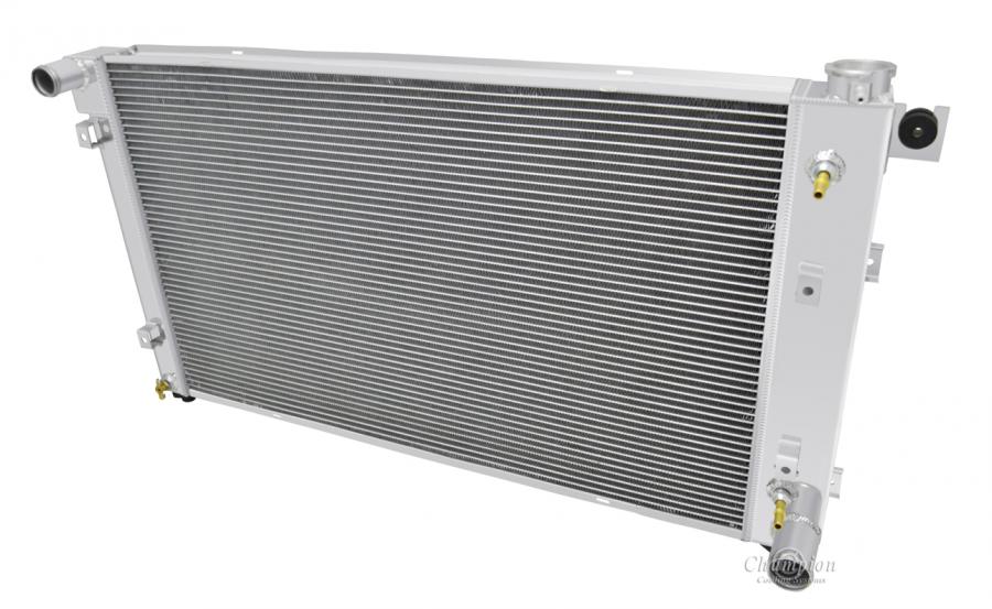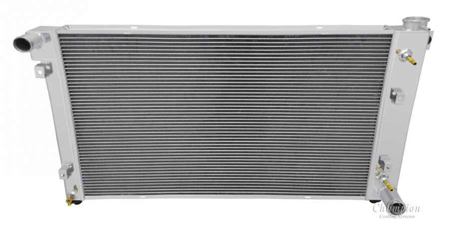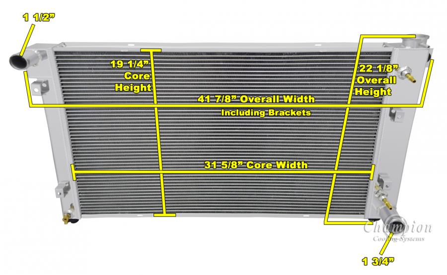 Our Champion Pro series radiators are designed to cool your high performance engine and to keep you and your car on the road. The Champion Pro series is designed using 11/16” tubes. These radiators are built with three rows of tubes, brazed aluminum cores which are tig-welded to aluminum tanks. All have approximately 14-16 louvered fins per inch, a brass petcock, and all are designed with aircraft grade aluminum. The strength of the aluminum allows for the improved design of larger tubes which allows a lightweight more affordable aluminum radiator to outperform a copper-brass radiator of similar dimensions. These radiators are typically 30-40% more efficient than their copper-brass equivalent. We would recommend one of these radiators for vehicles applications with 800 horsepower or less.