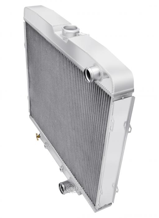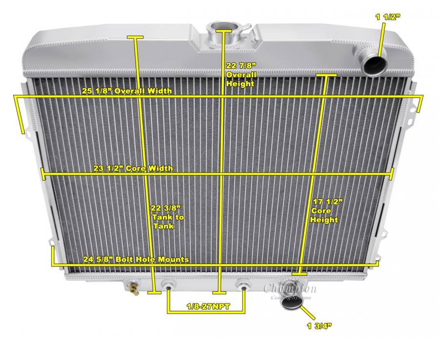 Our Champion Pro series radiators are designed to cool your high performance engine and to keep you and your car on the road. The Champion Pro series is designed using 11/16” tubes. These radiators are built with three rows of tubes, brazed aluminum cores which are tig-welded to aluminum tanks. All have approximately 14-16 louvered fins per inch, a brass petcock, and all are designed with aircraft grade aluminum. The strength of the aluminum allows for the improved design of larger tubes which allows a lightweight more affordable aluminum radiator to outperform a copper-brass radiator of similar dimensions. These radiators are typically 30-40% more efficient than their copper-brass equivalent. We would recommend one of these radiators for vehicles applications with 800 horsepower or less.