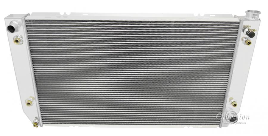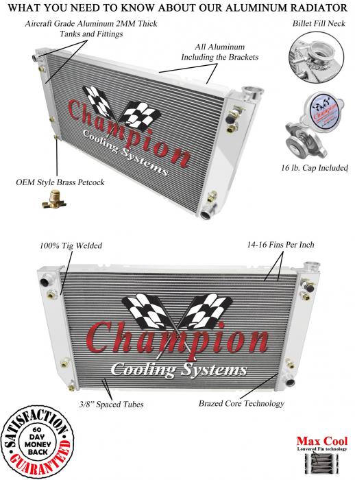 Our Champion Pro series radiators are designed to cool your high performance engine and to keep you and your car on the road. The Champion Pro series is designed using 11/16” tubes. These radiators are built with three rows of tubes, brazed aluminum cores which are tig-welded to aluminum tanks. All have approximately 14-16 louvered fins per inch, a brass petcock, and all are designed with aircraft grade aluminum. The strength of the aluminum allows for the improved design of larger tubes which allows a lightweight more affordable aluminum radiator to outperform a copper-brass radiator of similar dimensions. These radiators are typically 30-40% more efficient than their copper-brass equivalent. We would recommend one of these radiators for vehicles applications with 800 horsepower or less.