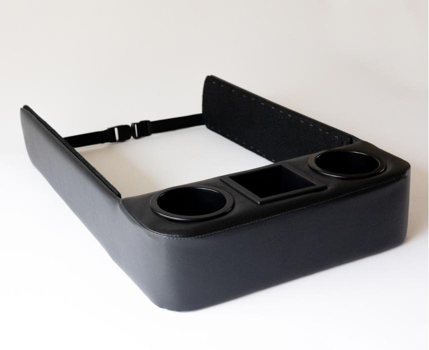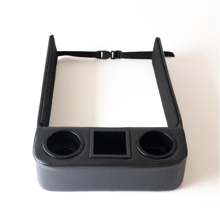 The RAM console uses the existing OE fold down center bench seat console as the base unit. The built-to-order console has a ledge on the back that slides under the OE console (when folded down against the bench seat). A wing on either side of the RAM console slides along the driver and passenger sides of the OE console. There is a strap and adjustable buckle that connects behind the OE console to secure the RAM console in place. Once secured the OE console can move up or down without effecting the RAM console.