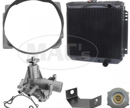 These engine cooling kits offer a discounted price on commonly upgraded and replaced components. Do it all at once and save ! All radiators are us made and come with a one year warranty against defects in workmanship. Fits 66/69 Rancheros, Falcons, with 289, 302 engines with air. 20 - 1/4 Center. Fan shrouds do not include mounting hardware. Kit includes one 3 row radiator, one fan shroud, one water pump, and one radiator cap
