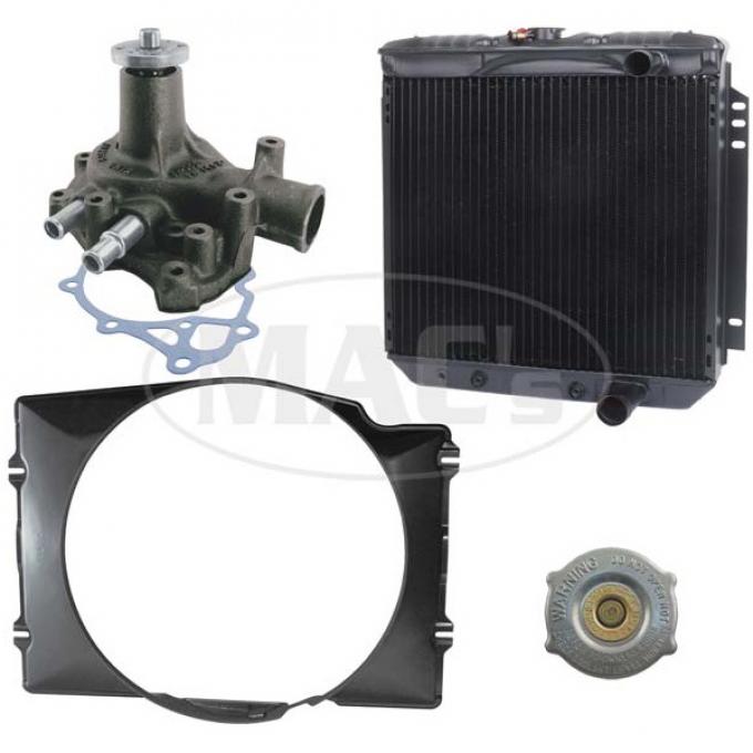 These engine cooling kits offer a discounted price on commonly upgraded and replaced components. Do it all at once and save ! All radiators are us made and come with a one year warranty against defects in workmanship. Fits 66/69 Rancheros, Falcons, with 289, 302 engines with air. 20 - 1/4 Center. Fan shrouds do not include mounting hardware. Kit includes one 3 row radiator, one fan shroud, one water pump, and one radiator cap