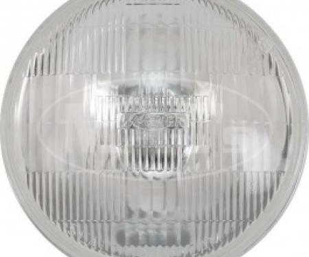 Officially licensed by Ford, Scott Drakes 7" Round Halogen Sealed Beam Headlamps feature authentic Ford markings and upgraded Halogen performance. This is a reproduction of a very desirable and rare version headlamp used on Classic Mustangs. We took new original Ford bulbs and replicated them in appearance while improving them with Halogen lighting technology. Halogen headlamps produce up to 40% more lighting power than original Tungsten bulbs, for a great safety improvement while maintaining an original look. Over the years Ford offered two FoMoCo script versions: one sandblasted etched logo, and the other a prominent reverse raised FoMoCo logo about 7/8" wide. We chose to reproduce the rare, highly sought reverse raised logo version on this bulb, which is more attractive and easier to read. Featuring a dual filament bulb with a 50-watt low beam and a 55-watt high beam. Sold individually
