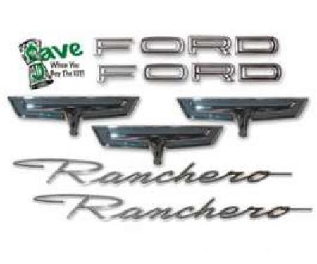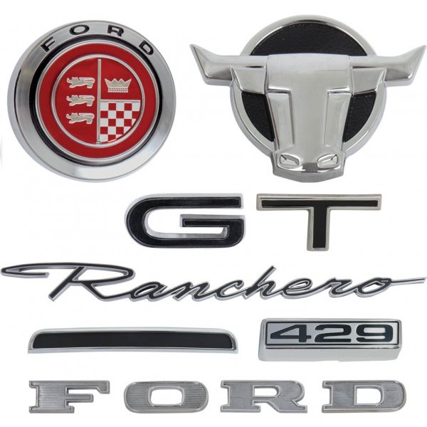 This kit includes two Ranchero scripts, one set of tailgate letters, two steer emblems, one grille bezel (GT) and emblem, 2 lower fender emblems, ten hash marks, 2 prs of GT letters and all attaching hardware. Save by purchasing all components at one time! All items in kit are quality made in the usa! Buy the kit and save!