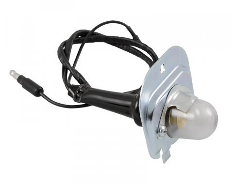 Our custom license plate light is a round tube with a small, elongated oval lens. Constructed from stainless steel to resist rust, it is 8-1/8" long & 7/8" in diameter & the special 12 volt bulb is included.