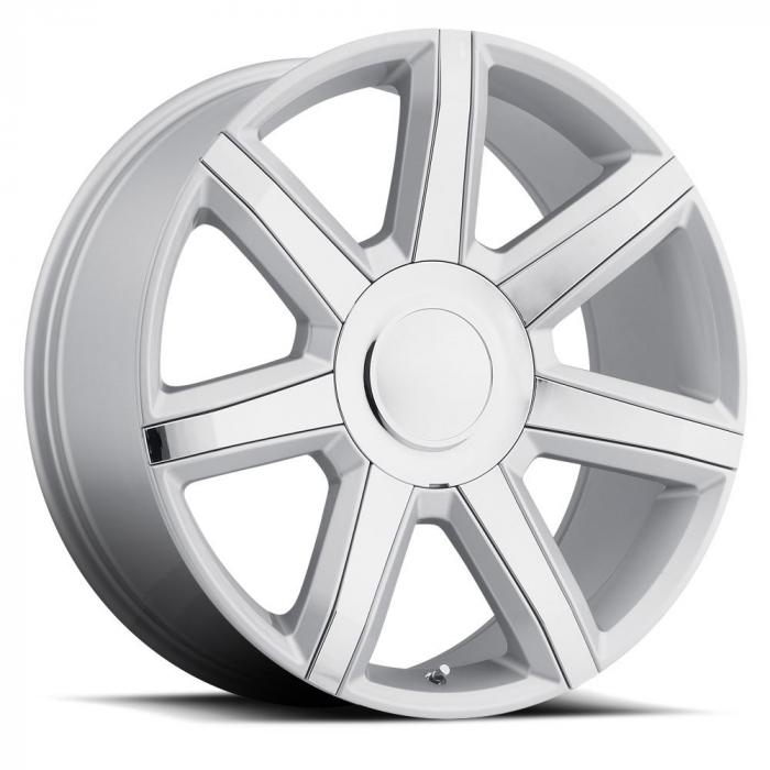 One of the newer Escalade wheel options, the Escalade Luxury Replica Wheel keeps your SUV current . The clean 7 spokes each have a plastic chrome insert that extends from lip to cap creating a two tone appearance.