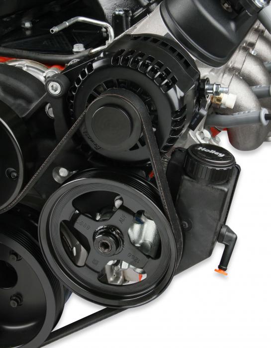 Holley's Premium Mid-Mount complete accessory system has all accessories pulled in tighter than other accessory drives. At the heart of the system is a "bracketless" design, where the accessories bolt directly to the water pump for a clean, integrated form. The design offers superb engine visibility to show off your horsepower, not your accessories. Among the many swap friendly features are bottom heater outlets for clearance in tight applications. The Holley designed alternator is just as innovative. This premium alternator utilizes 6-phase technology as found on the C7 Corvette. The water pump also shares its design efficiencies with that of the C7 Corvette. The compact and reliable SD7 A/C compressor and Type II P/S pump with baffled reservoir are also integrated. The Mid-Mount drive completes Holley's trilogy of accessory solutions giving a third option compared to the High and Low-Mount previously released. All three accessory solutions are for LS engines. When we say "complete", we mean complete. The Mid-Mount system comes with everything you need. All accessories are included; the water pump, A/C compressor, Alternator, P/S pump with reservoir, and an SFI certified damper w/hard anodized billet crank pulley. All pulleys and the belt are supplied. Even heater hose adapters, power steering to -6 AN hardline, and the alternator plug/harness are included. Easy assembly was a priority during the entire development of this accessory solution. Color graphical instructions walk you through every step of the ultra-easy installation. The Premium Mid-Mount system comes with dress up pulley covers and an SFI certified damper. Partnered with this damper is a billet 6061-T6 aluminum hard anodized crank pulley. This system is ready for the racetrack if you want to play or just be ready for anything on the street. Patent - www.holley.com/patents/