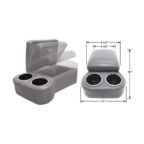 How's this for a great idea? This BC Seat Cruiser Console is specifically designed to fit on any bench seat, it features 2 king size drink holders, now with chrome edge trim, plus the hinged top opens to reveal a large storage compartment. The console top is softly padded to provide you with a comfortable armrest & a sewn-in strap is provided to secure the console to the seat. Available in a dozen beautiful colors, the entire console is upholstered in long wearing automotive grade vinyl with double stitched French seams to complement almost any interior.