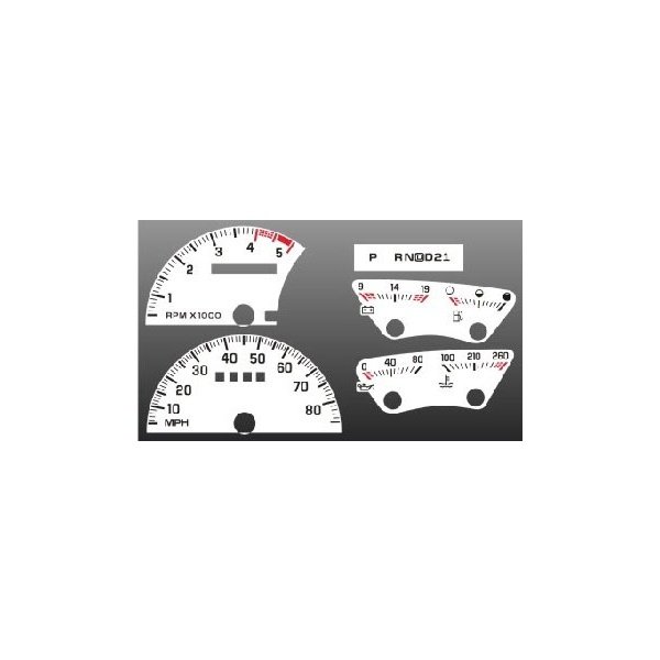 White Face Overlays Included In This Kit: 85 MPH Speedometer,5000 RPM Tachometer,Volts Gauge,Temperature Gauge, Oil Pressure Gauge,Shift Indicator Gauge,Small Fuel Gauge
