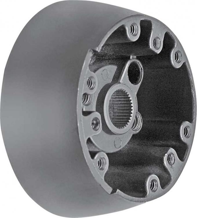 Reproduction steering wheel hub for 1967-68 Chevrolet (1967-72 Truck). This steering wheel hub adapter mounts directly to the top of the steering column and retains the factory style woodgrain or comfort grip steering wheel.