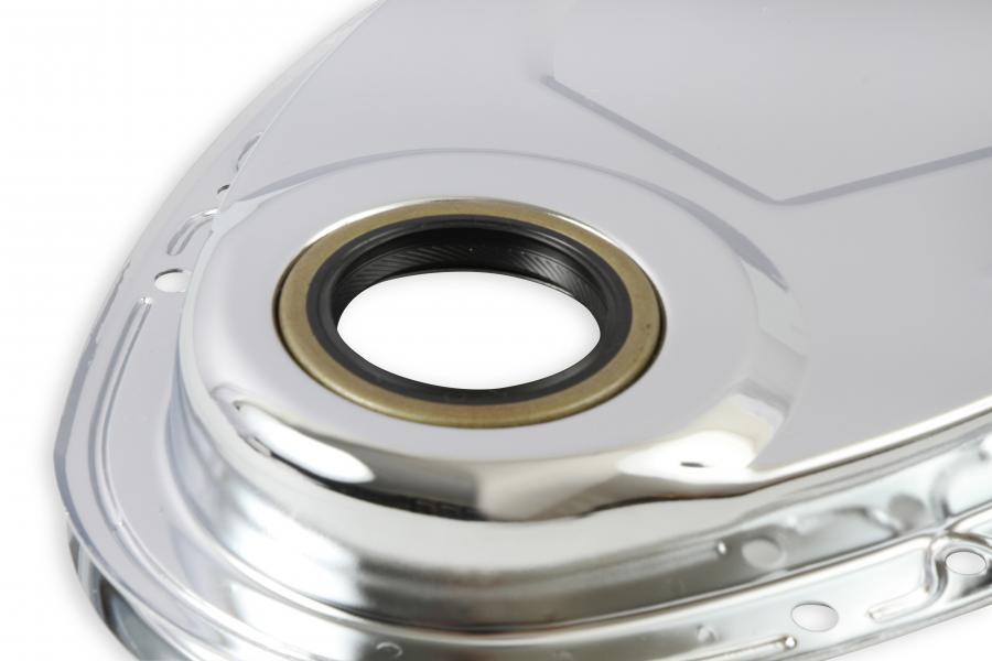 TIMING COVER; CHROME PLATED; USE W/OEM TIMING CHAIN; COMPLETE KIT; DOUBLE ROLLER TYPE CHAIN/GEAR DRIVES NEED TO CHECK CLEARANCE;