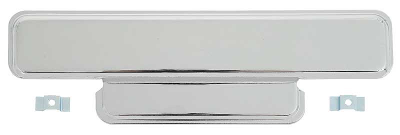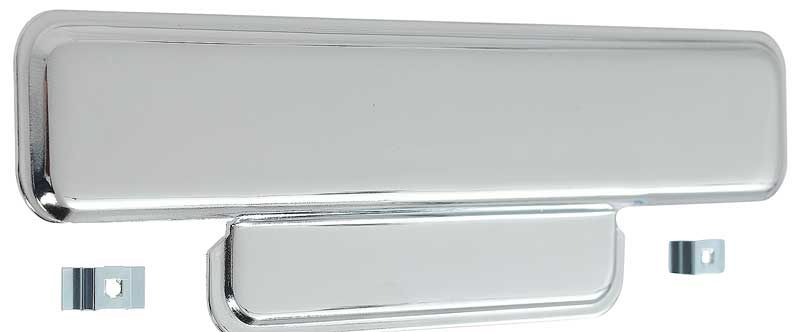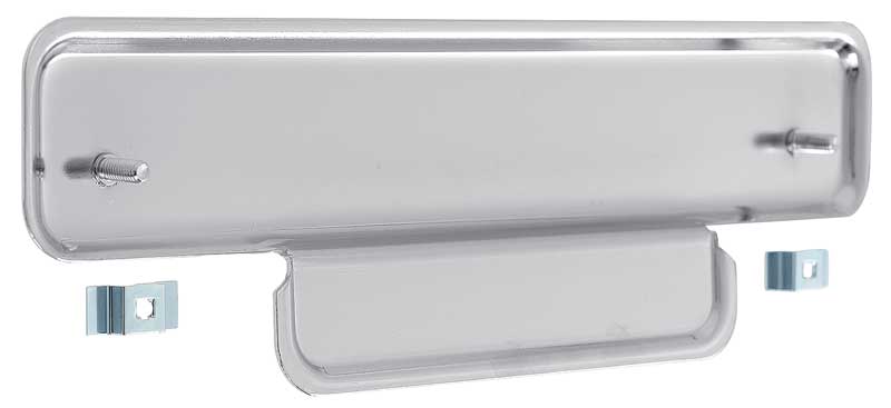 Reproduction stamped steel radio hole cover, or radio delete plate for the dash on 1951-52 Ford F-Series trucks. This steel plate install on the lower center portion of the steel dash to cover the radio hole one trucks that were not originally equipped with a radio. This plate is smooth, without the Ford block lettering, for a cleaner look and is chrome-plated for a custom look. Installs via two push nuts that are pushed onto the pins on the back side of the cover plate. Replaces OE # 1C-8104371