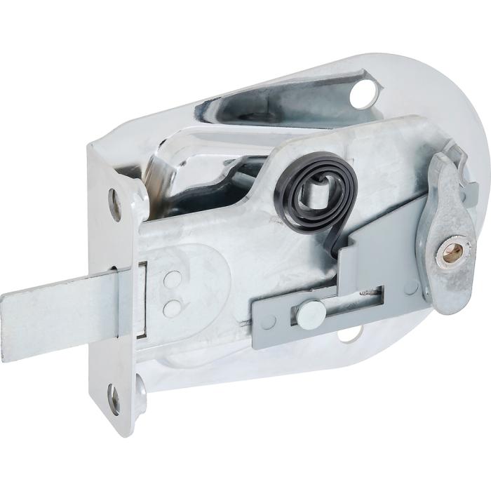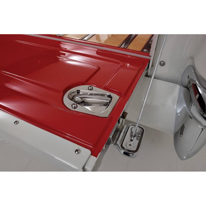 Reproduction tailgate latch assembly for the LH side on 1955-58 Chevrolet Cameo or GMC Suburban Carrier pickups. Housing is manufactured in stamped steel and plated in bright chrome for an original appearance. Handle is die-cast metal with bright chrome finish, as original.