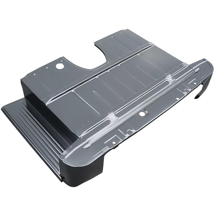 Reproduction of the original cab floor pan with side step for use with 1955-59 Chevrolet and GMC Pickup truck models. Each floor pan is manufactured in stamped steel to original factory specifications featuring correct contours for an authentic appearance and fit. Features all the correct factory holes, ribs, and braces just like original. Comes with black EDP coating for rust and corrosion prevention.