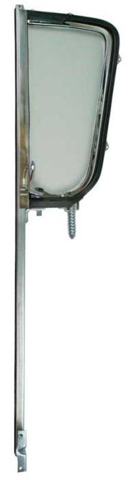 Reproduction of the original door vent window assembly designed for use with 1955-1959 Chevrolet and GMC truck models. Each glass assembly is manufactured to OE specifications replicating the original in quality, fitment, and design. This vent glass assembly features the black vertical door glass run channel with felt lining, chrome vent glass frame, clear window glass, weatherstrip, and the latch handle. Note: For use with 1955 2nd design (late) models.