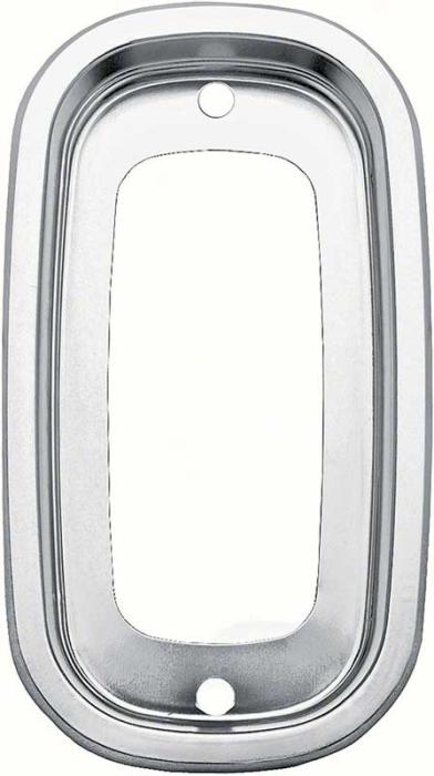 Reproduction tail lamp bezel for 1960-66 Chevrolet and GMC Fleetside models. Each bezel is manufactured in stamped aluminum to factory specifications replicating the original in design and fitment. Features correct contours, mounting points, and an original style clear anodized finish. Sold individually.