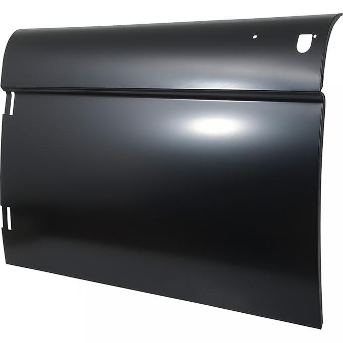 Full replacement sheet metal door skin for 1966-67 Ford Bronco with non-locking doors. This is a full replacement door skin, stamped and assembled to meet or exceed factory specitfications fit and appearance. Skins are EDP coated inside and out to prevent corrosion. This skin does not have the provision hole for the external door lock cylinder. Fits LH Driver Side.