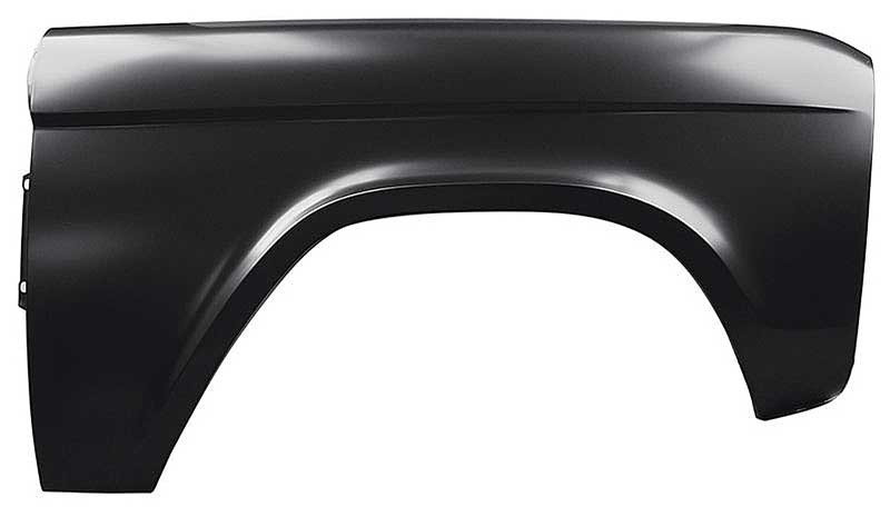 Reproduction of the original front fender designed for use with 1966-77 Ford Bronco models. Each front fender is manufactured in stamped steel to original factory specifications featuring correct contours for an authentic appearance and fit. The emblem holes are not punched for a clean look but can be easily drilled for a stock appearance. Comes with a black EDP coating for rust and corrosion prevention. For use on RH passenger side