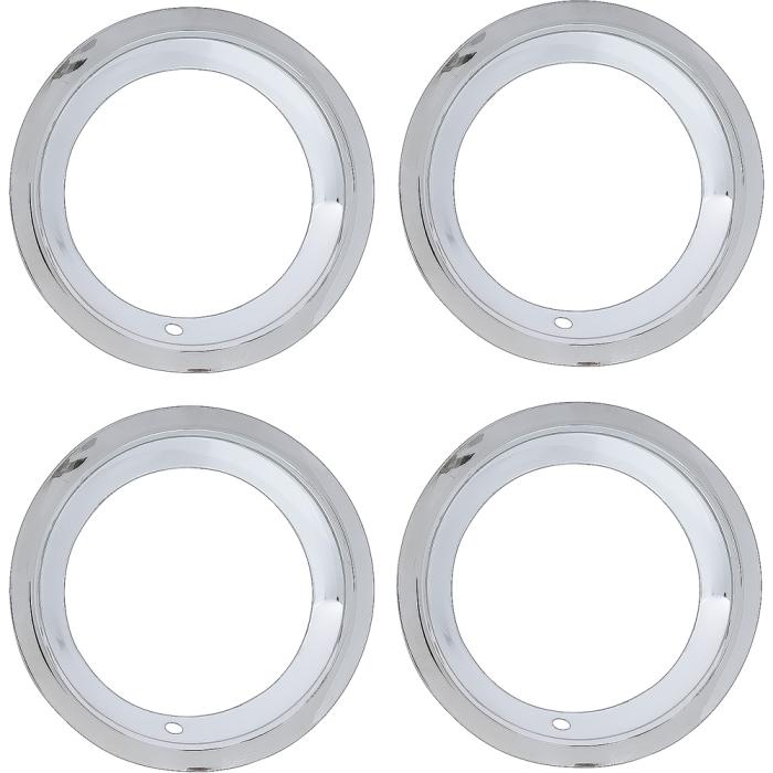 Excellent quality reproduction chrome plated wheel trim ring set. Features a squared edge design and a smooth flat lip. Measures 15" in diameter and 3" in width to fit most of the popular 15" Chevrolet Rally, Pontiac Rally II, and 1969-70 Chevrolet SS-style steel wheels. Sold as a set of 4.