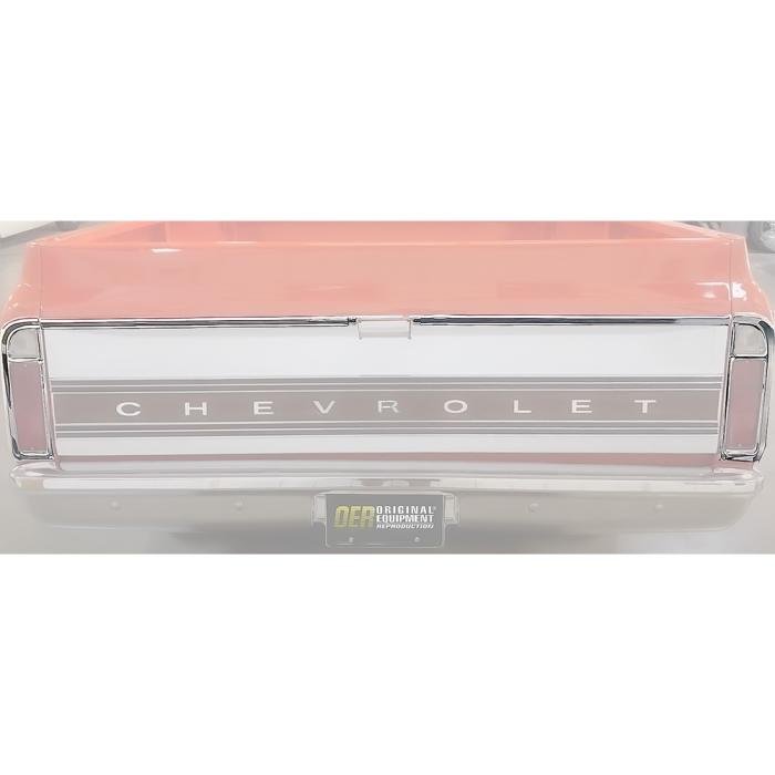 Reproduction tailgate molding set for 1969-72 Chevrolet and GMC fleetside pickups. Each 5-piece set includes upper moldings and tail lamp corner moldings with molding clips required for installation. For tailgates with stock tailgate handle.
