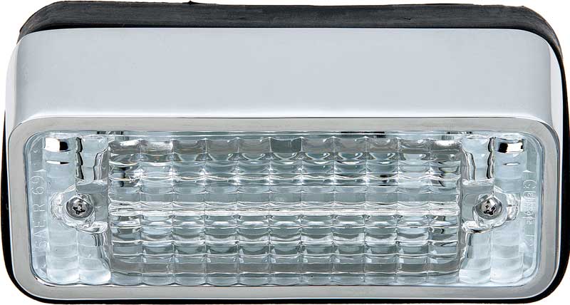 Reproduction of the original style cargo lamp assembly designed for use with 1969-72 Chevrolet and GMC pickup truck models. Each assembly is manufactured to correct factory specifications featuring a chrome housing, lens, bulb, rubber mounting gasket, and hardware.