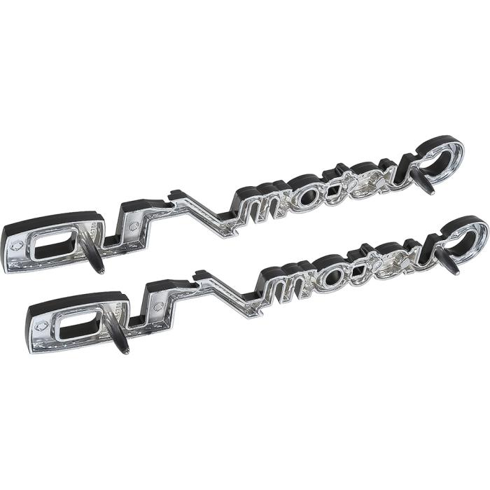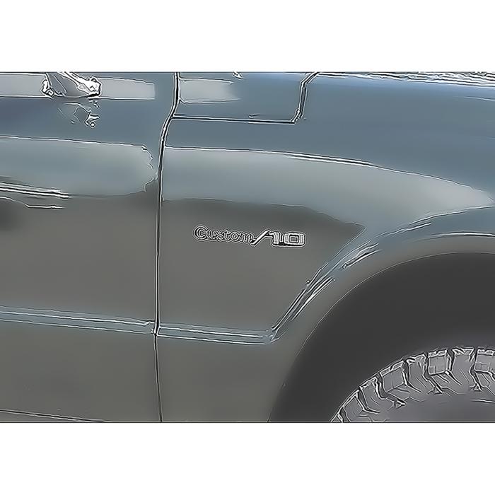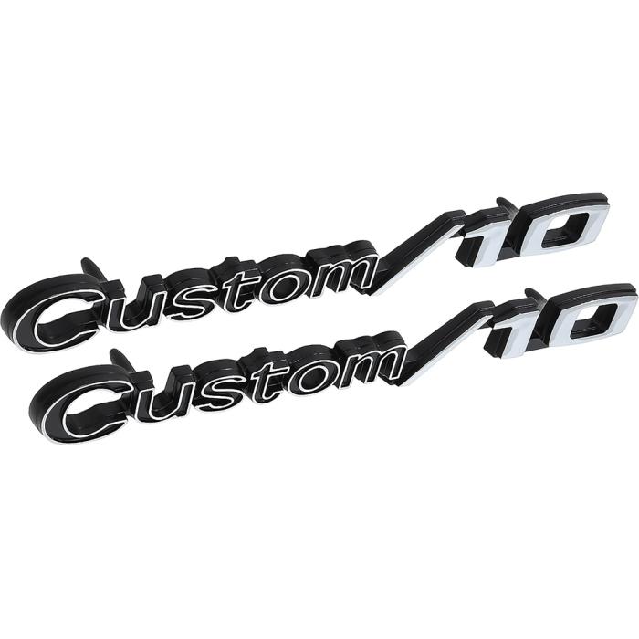 Reproduction "Custom-10" front fender emblem set for 1969-72 Chevrolet 1/2 ton, 2-wheel drive, C10 Pickup, and C10 Suburban models. Each emblem set is manufactured in zinc die-cast metal with polished chrome appearance. Features the correct black "Custom" lettering with a chrome accent and a number 10 that is an exact replica of the original GM emblem. Emblem features two mounting studs spaced 6-3/4" apart. Sold as a pair. Replaces OE # 3944759 & # 3953662.