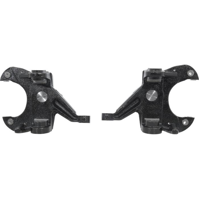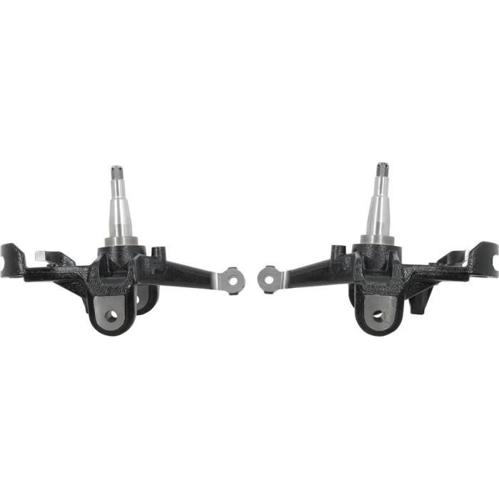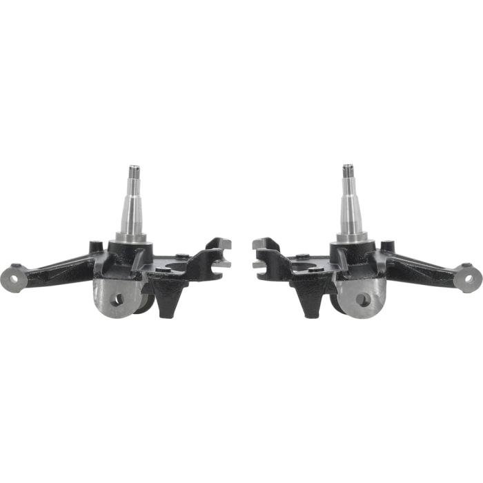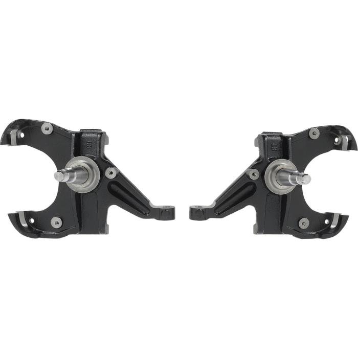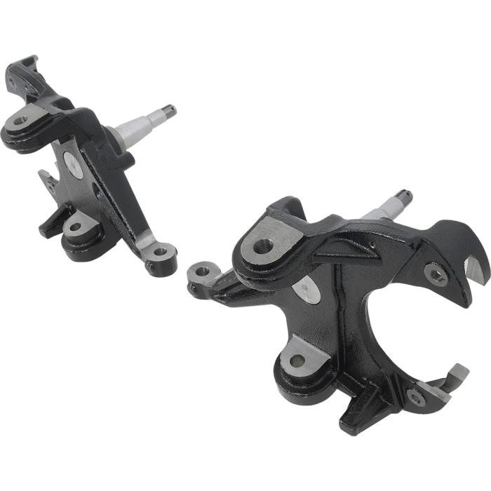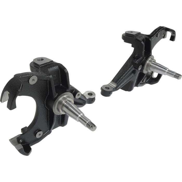 Lower your 1971-72 Chevy or GMC 1/2 ton 2WD truck 2-1/2" with our cast iron disc brake drop spindles. These will enhance your stopping power, steering and handling, and give your truck a better stance. Cast from the highest quality Ductile Iron with 4140 Chrom-moly CNC machined pins. Designed to use 1971-87 1-1/4" rotors, calipers and bearings.