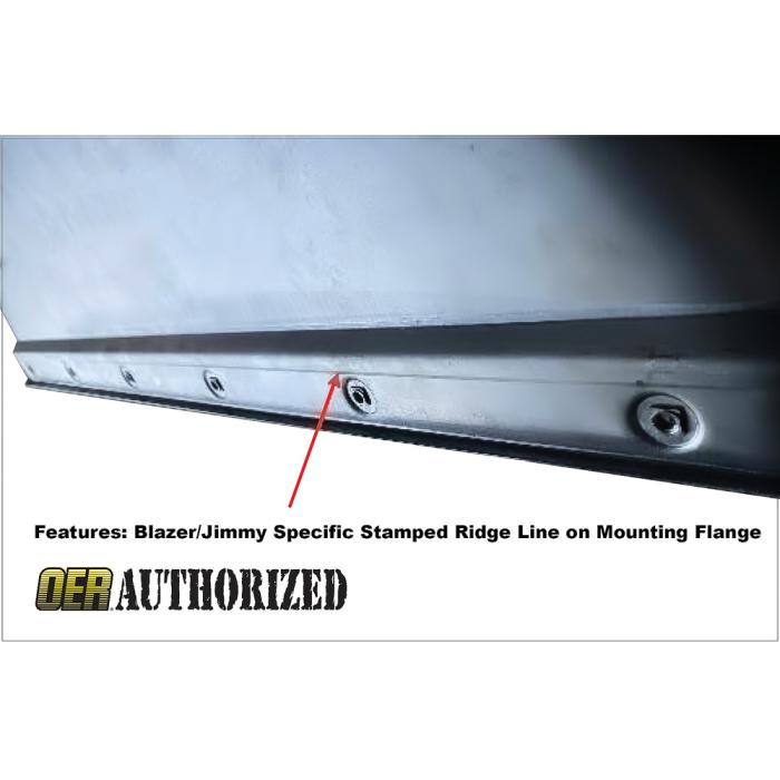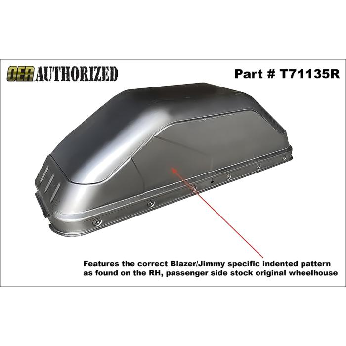 Reproduction wheelhouse panel for 1973-91 Chevrolet and GMC Blazer, Jimmy models. Each wheelhouse panel is manufactured in stamped steel to exact factory specifications, featuring the correct contours, bends, and mounting points for an authentic fit and appearance. This direct bolt-on replacement panel fits the left-hand (driver side) position. This wheelhouse is specific to the Blazer, Jimmy featuring the correct stamped ridge line on the mounting flange that pickup wheelhouses do not have. Designed for the RH, passenger side, this wheelhouse panel features the correct stamped indentation pattern that is unique to the RH Blazer/Jimmy wheelhouse. For the opposite side, refer to part number # T71135L. Comes finished in durable black EDP coating to prevent rust and corrosion. Sold individually.