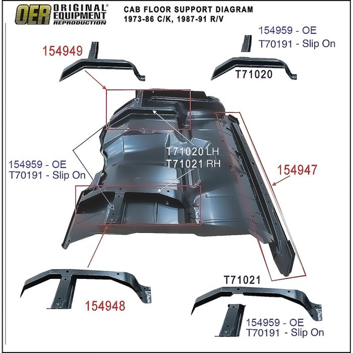 Reproduction slip-on style floor pan floor support brace for all 1973-86 Chevrolet and GMC trucks, and 1987-91 Blazer, Jimmy, Suburban, crew cab and dually models. Manufactured in heavy gauge stamped steel for a solid repair of your fatory support brace. This floor support reinforcement slips over the underfloor bracing and is designed to be welded into place to add support to the floor pan. Each support is manufactured to slip over your rusted or damaged original to restore the structural integrity of your floor braces without removal of the original brace. This item is slightly oversize to allow it to slip over the original brace, concealing the damaged factory brace while adding the vital support that is needed to strengthen your floor. Removal of factory brace is not necessary when using this slip-on style part.
