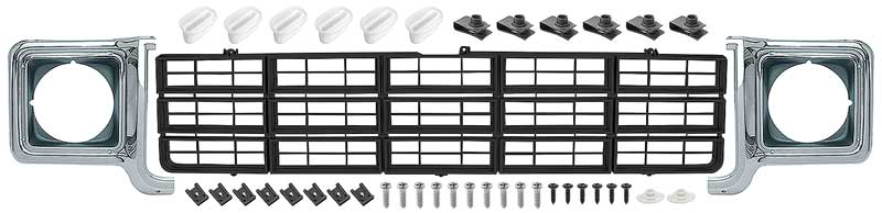 Give your 1977-78 Chevy pickup a facelift with our convenient "emblem-delete" replacement grill and headlamp bezel set. This basic set includes the 1 center grill, 2 headlamp bezels, headlamp bezel screws, nylon headlamp bezel mounting nuts, grill mounting screws, and grill mounting spring nuts. This aftermarket grill is designed to eliminate the bulky Bow Tie emblem on the front of your truck, providing a cleaner semi-custom appearance. Grill is black in color, while plastic headlamp bezels are chrome plated with black accent paint.