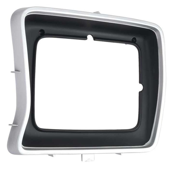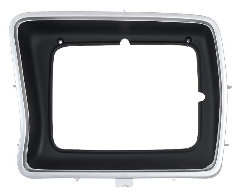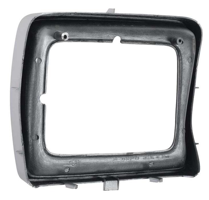 Reproduction driver side head lamp door for 1978-79 Ford F100, F150, F250, and F350 pickup trucks and Broncos with rectangular headlights. This bezel, with the argent silver perimeter and dark inset paint is a correct replacement for 1978 Ranger trim vehicles and all 1979 models. Replaces Ford part# D8TZ-13064.