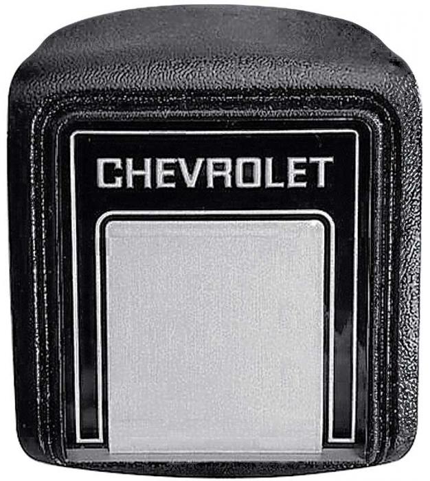 Reproduction horn cap for the center of the steering wheel on various 1978-91 Chevrolet truck models with NK3/N31 Custom steering wheel option. Each cap is manufactured in injection molded plastic, covered with a leather grain vinyl material and finished with a silver accent piece and the CHEVROLET wording beneath a clear plastic lens. Officially licensed by General Motors. Replaces GM part numbers # 9761177, 17987491, 9761438. Fits GM part number # 9760817 steering wheel.