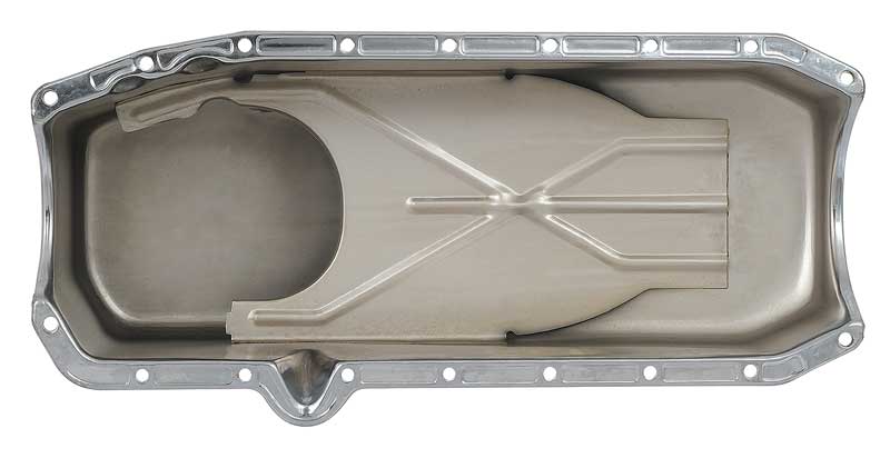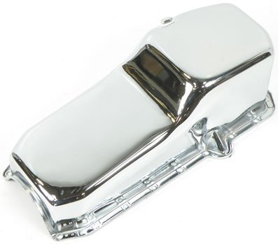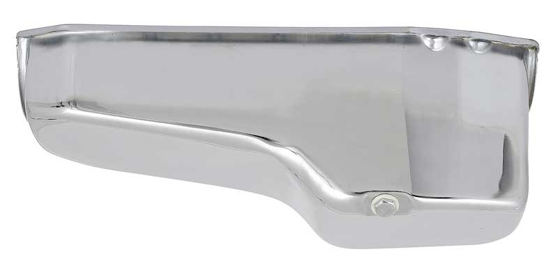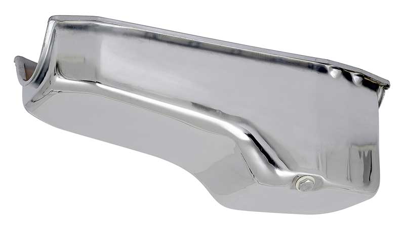 Replacing your original oil pan with a chrome reproduction can enhance the appearance as well as add a high performance look! This pan is designed to fit as original, has a 4 quart capacity (add 1 quart when changing filter) and includes a drain plug. The dipstick is on the passenger side and you can use the original oil pump pickup. Uses a two-piece rear main seal.