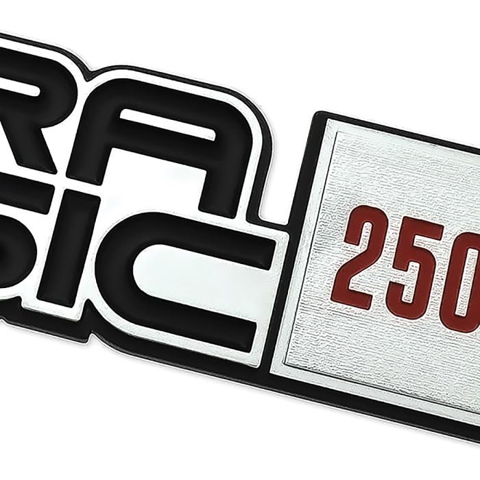 Reproduction "Sierra Classic 2500" emblem set that mounts to the front fender of various 3/4 ton 1981-86 GMC C/K and 1987-89 GMC R/V truck and SUV models. Manufactured in injection molded plastic with a simulated brushed stainless steel appearance and featuring red and black painted accents as original. Includes ABS plastic backing gasket. Mounting nuts are sold separately. Replaces GM 's # 14051862, 14056465. Sold as a pair.