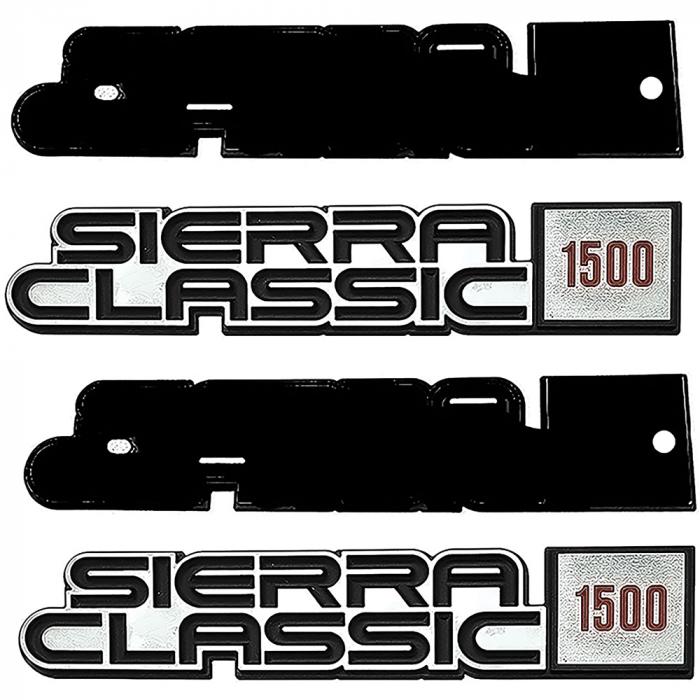 Reproduction "Sierra Classic 1500" emblem set that mounts to the front fenders of various 1/2 ton 1981-86 GMC C/K and 1989 GMC R/V truck and SUV models. Manufactured in injection molded plastic with a simulated brushed stainless steel appearance and featuring red and black painted accents as original. Includes ABS plastic backing gasket. Mounting nuts are sold separately. Replaces GM # 14051861. Emblems are sold as a pair.