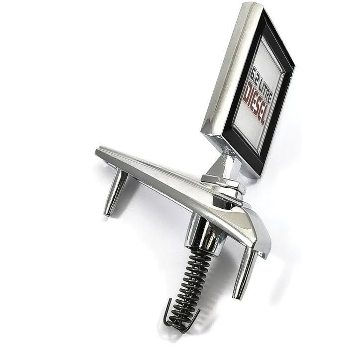Reproduction header panel/hood ornament for 1981-87 Chevrolet and GMC truck models with a 6.2 litre diesel. This is an exact reproduction that is spring loaded and mounts to the hood. Replaces GM# 14037946/14032780. Does not include the gasket.