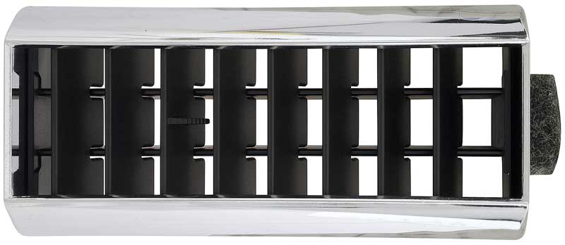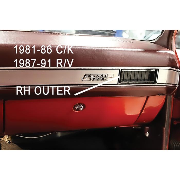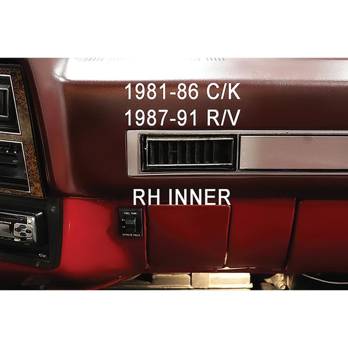 Reproduction air conditioning dash vent deflector for 1981-86 Chevrolet and GMC C/K Pickup, Blazer, Jimmy, and Suburban models, and 1987-91 R/V Pickup truck models with AC. This deflector installs on the right hand, passenger side of the dash, and replaces the inner or outer vent outlets. 2 required per vehicle.