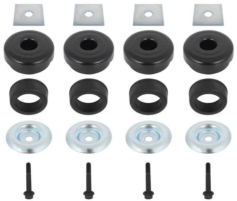 Reproduction front and rear cab mount bushing set for 1984-86 Chevrolet and GMC standard cab C/K Series pickups, and 1987 Chevrolet and GMC standard cab R/V Series pickups. Designed to restore proper cab-to-frame alignment and reduce vibration, this set is manufactured to OEM specifications for fit, durability, and performance. Each 20-piece kit includes upper and lower bushings, bolts, spacers, and washers for a complete installation. Perfect for restorations, frame-off builds, or replacing worn cab mounts.