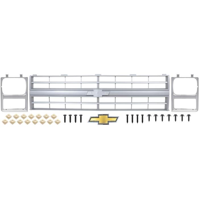 Give your 1985-86 C/K and 1987-88 R/V Chevy models with single headlamps a facelift with our convenient replacement grill and headlamp bezel set. This basic set includes the 1 center grill, 2 headlamp bezels for single headlamps, headlamp bezel screws, nylon mounting nuts, grill mounting bolts, and 1 Bow Tie emblem with spacers.
