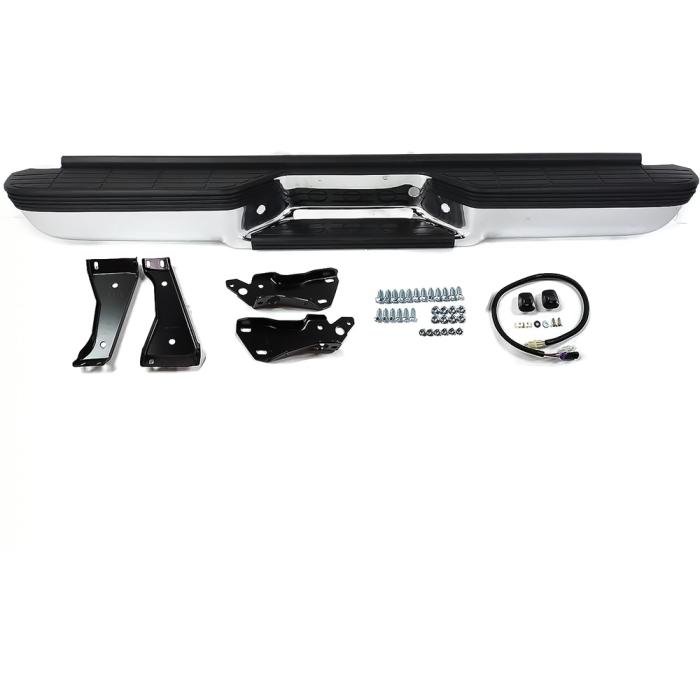 Reproduction rear step bumper for 1988-00 Chevrolet/GMC C/K GMT400 series fleetside pickup. Each chrome step bumper is equipped with a molded polymer step pad on the top bumper surfaces for a better grip when using the bumper as a step to get into and out of the pickup bed. Features a recess area for the license plate, and a ledge to mount a trailer hitch if desired. Simply knock out the plastic filler to bolt on a hitch ball (not included). Each bumper comes equipped with brackets, hardware, and license plate lamp for proper illumination of license plate.