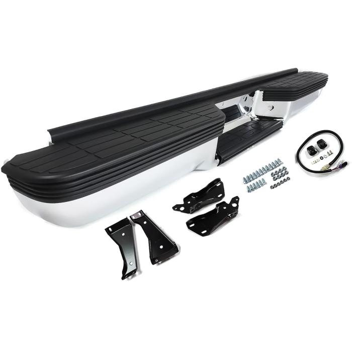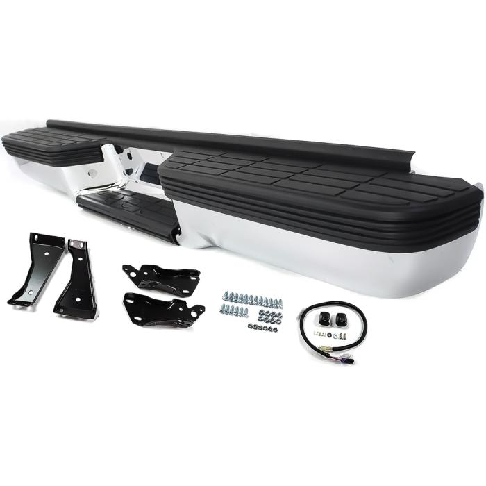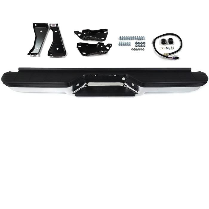 Reproduction rear step bumper for 1988-00 Chevrolet/GMC C/K GMT400 series fleetside pickup. Each chrome step bumper is equipped with a molded polymer step pad on the top bumper surfaces for a better grip when using the bumper as a step to get into and out of the pickup bed. Features a recess area for the license plate, and a ledge to mount a trailer hitch if desired. Simply knock out the plastic filler to bolt on a hitch ball (not included). Each bumper comes equipped with brackets, hardware, and license plate lamp for proper illumination of license plate.
