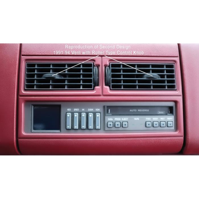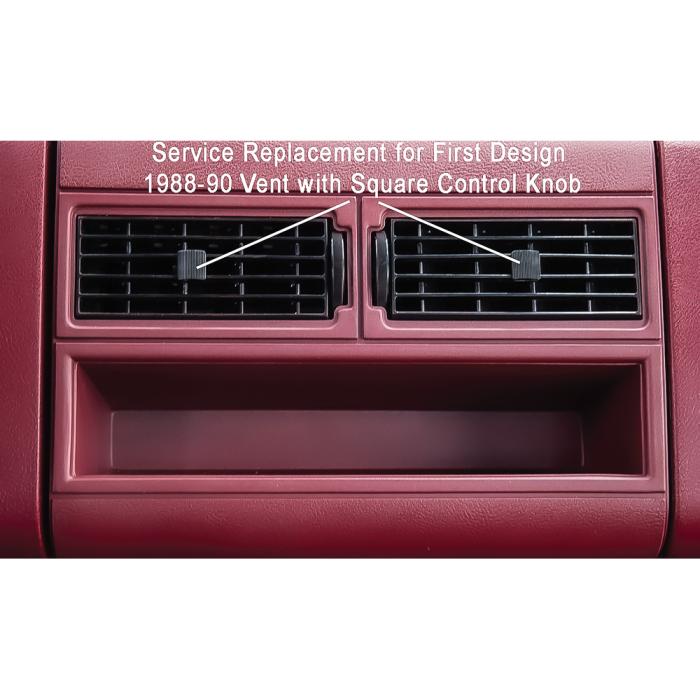 Reproduction AC or Heater vent center deflector assembly for one side in the center of the dash in 1988-94 Chevrolet/GMC C/K pickup and 1992-94 Blazer, Tahoe, Yukon, and Suburban models. Manufactured in black injection molded ABS plastic. Sold individually. 2 vents are required per vehicle. Second design vent features the 1991-up style horizontal roller type directional control knob in the center of the vent to direct airflow left or right, but will fit and install as original on all 1988-94 C/K Pickup and 1992-94 SUV models.